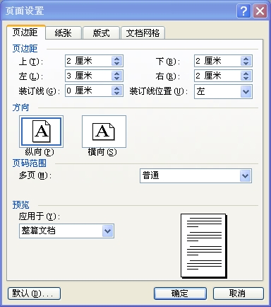 页边距:上 2cm, 下 2cm, 左 3cm, 右 2cm;